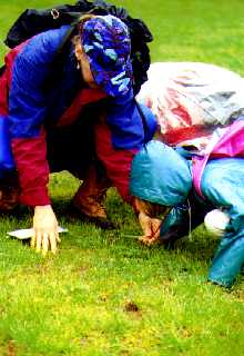 and students from Brunswick observing wildflowers in the fields at Chops Point |