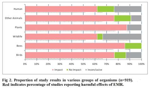 In 2011 India’s Ministry of Environment and Forest released their Report on Possible Impacts of Communication Towers on Wildlife Including Birds and Bees. The Ministry reviewed 919 studies and while their mandate was to report back on birds and bees, the report touches on other wildlife as well. Seventy-seven percent of the studies showed adverse impacts to birds from towers and their radiofrequency radiation emissions while only 11% found no impacts and 12% were inconclusive. Eighty-seven percent of studies showed bees suffering effects and 13% of studies showed no effect to bees. Sixty-two percent of studies showed effects on other wildlife, 5% showed zero effect and 33% were inconclusive. Eighty-eight percent of studies showed negative effects to plants while 12% were inconclusive.