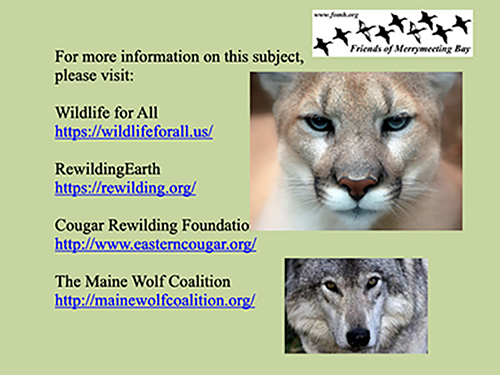 More and more, scientists have begun understanding the ways in which many ecosystems are driven top-down by the presence of predators, whether starfish, sea otters, wolves or cougar. Unfortunately, beginning with the relatively rapid elimination of mega-fauna, two-legged predators have taken an ever-increasing role as poor substitutes for nature’s apex wild predators. We are not doing a very good job. For example here in Maine, deer and rodent populations are out of control which in turn fosters unnatural excesses of ticks, diseases, weeds and invasive plants. With cougars and wolves eliminated we now set our rifle sights on coyotes, a poor replacement for the virtually extirpated former top predators but still better than nothing.